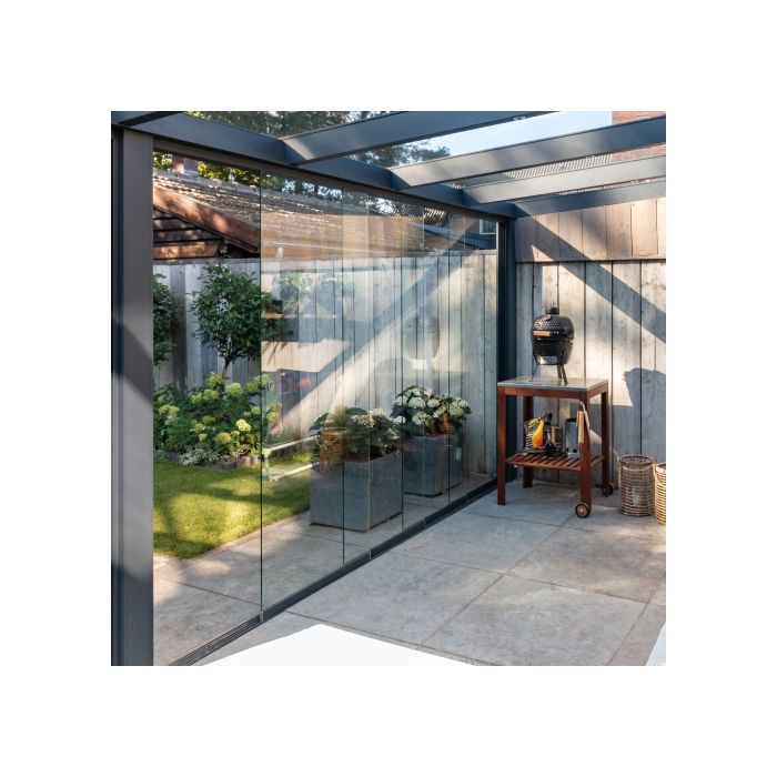 De Glaswand V764 Olivera van is een degelijke glaswand van schuifbare glaspanelen van Verano.